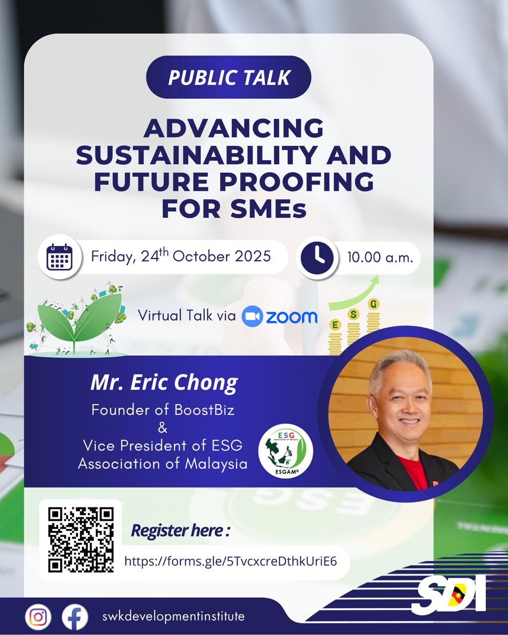 SDI will be organising a public talk on “Advancing Sustainability and Future Proofing for SMEs” by Mr. Eric Chong, Founder of BoostBiz and Vice President of ESG Association of Malaysia.